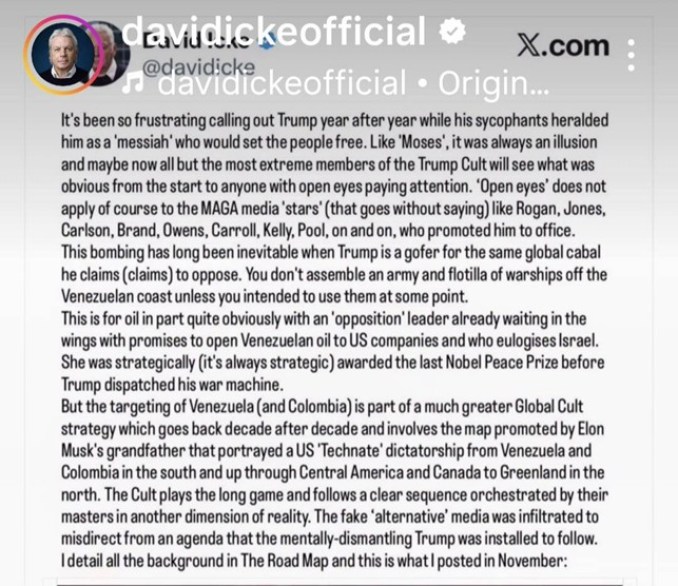 Home NewSpeek.info DAVID ICKE HAR SOM EN AF DE GANSKE FÅ FORSTÅET, AT TRUMP ER SKUESPILLER NewSpeek.info·January 7, 2026·1 min read·0DAVID ICKE HAR SOM EN AF DE GANSKE FÅ FORSTÅET, AT TRUMP ER SKUESPILLER See alsoNewSpeek.info·January 5, 2026·0PATRICK WOODS PROGNOSE FOR 2026 – NewSpeek Source link Følg os på Telegram - Klik Her