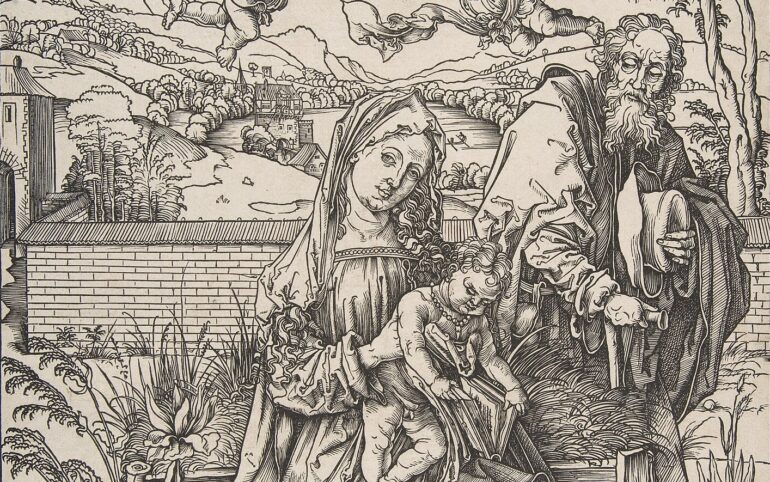 Albrecht Dürer (1471–1528). Tresnitt, 38,6 x 28 cm, The Metropolian Museum of Art, New York. Kunstneren har plasert familien i et utendørsmiljø, og de tre harene kan symbolisere Trefoldigheden, og dessuten fruktbarhet. Den lille Jesus undersøker en bok, sannsynligvis Skriften, hvor han skal være profetert. To bevingede englebarn kroner Maria. Man bør ellers legge merke […]