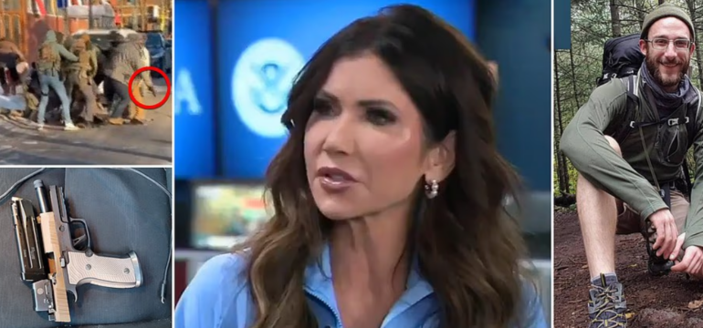 Ministeren for indenrigssikkerhed, Kristi Noem, hævdede på en pressebriefing søndag, at betjentene ‘tydeligt frygtede for deres liv’ og affyrede forsvarsskud mod Pretti, efter at han havde ‘voldeligt’ gjort modstand mod føderale agenter. (DailyMail)