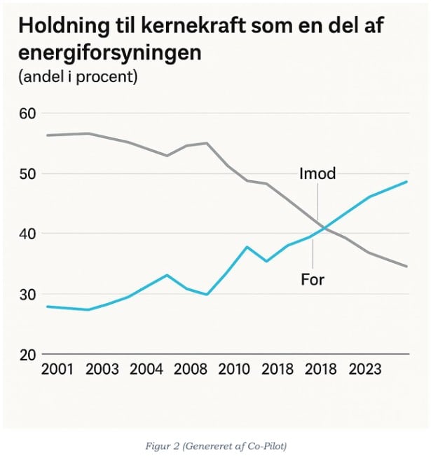 Atomkraft er det mest interessante område. Nu er den folkelige opbakning hertil høj og stigende især for yngre danske mænd og kvinder. (Se figur 2) For 25 år siden var opbakningen under 50%, men i marts 2025 var 67 % af den danske befolkning positiv for kernekraft til energiforsyning.