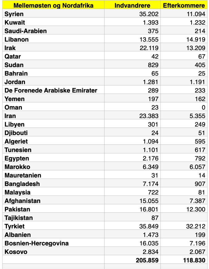 Ifølge Danmarks Statistiks tal, var der i Danmark i 4. kvartal af 2025 205.859 indvandrere og 118.830 efterkommere fra MENAPT-landene. I alt 324.689 personer fra MENAPT-landene. Altså ikke 305.000 som oplyst i Berlingske.