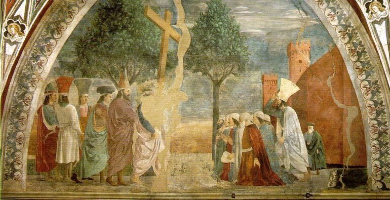 Piero della Francesca (1415–1492). Freske, 390 x 747 cm, Basilica di San Francesco, Arezzo. Italiensk titel: Esaltazione della Croce. Vi finner en redegjørelse for legendene rundt Det sanne kors her.