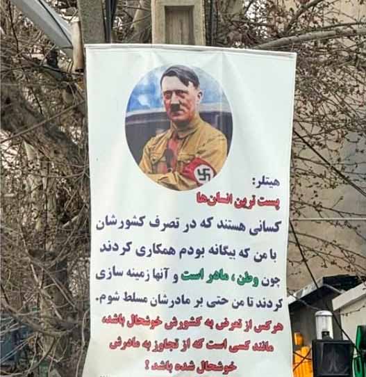 Overalt i Iran er der for nylig dukket store plakater op af Mojtaba Khamenei og Adolf Hitler. Khamenei med det iranske flag, Hitler i uniform med hagekors. Under Hitler står der en tekst på persisk, der foregiver at stamme fra den gamle tyske diktator: