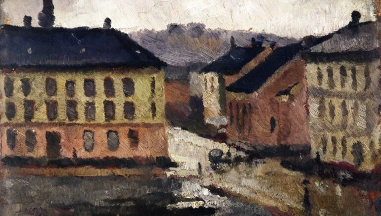 Edvard Munch (1863–1944). Olje på papp, 22 x 29,5 cm, privateie. Vi kan dra kjensel på krysset Sofienberggaten og Thorvald Meyers gate i Christiania (fra 1924 Oslo), der vi finner Metodistkirken, som fortsatt står der.