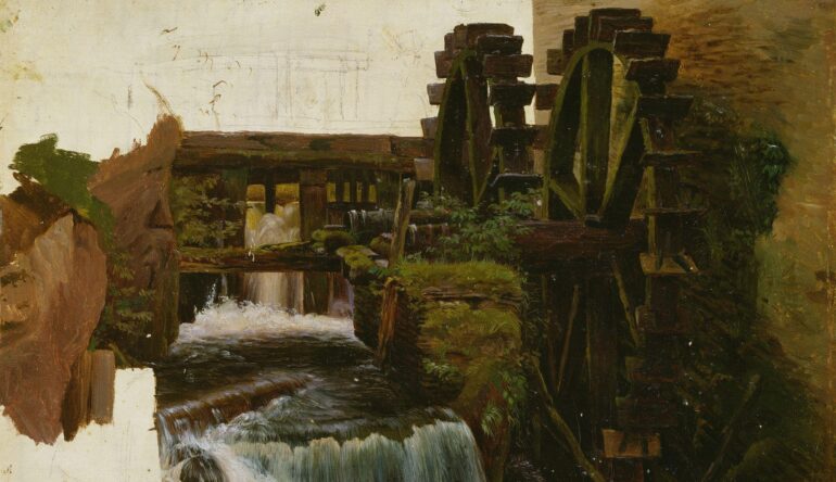 Adolph Tidemand (1814–1876). Olje på lerret, 23,5 x 31 cm, Nasjonalmuséet, Oslo. Det er opplyst at kunstneren fant dette motivet, Winkelser Mühle, ved Düssel-elven et par kilometer oppover ved Neanderthal-kløften mellom Düsseldorf og Wuppertal. Bildet ble signert, men knapt fullført.